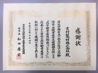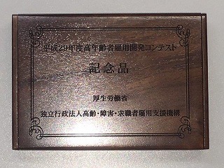 厚生労働省及び独立行政法人高齢・傷害・求職者雇用支援機構共催による「高年齢者雇用開発コンテスト」に応募しました。 残念ながら入選には至りませんでしたが、日ごろの取組を評価してもらい、感謝状と記念品を受領しました。 これからも、高齢者雇用への取組を継続していければと思っております。